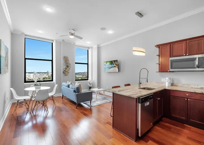 L'appartamento Modern 1Br With Rooftop Pool & Gym Filadelfia proporziona prossimità ad attrazioni turistiche come la Piazza Schmidt's, che si trova a soli 5 minuti a piedi. Situato a 600 metri dai Liberty Lands, l'appartamento offre una piscina privata per il divertimento degli ospiti.